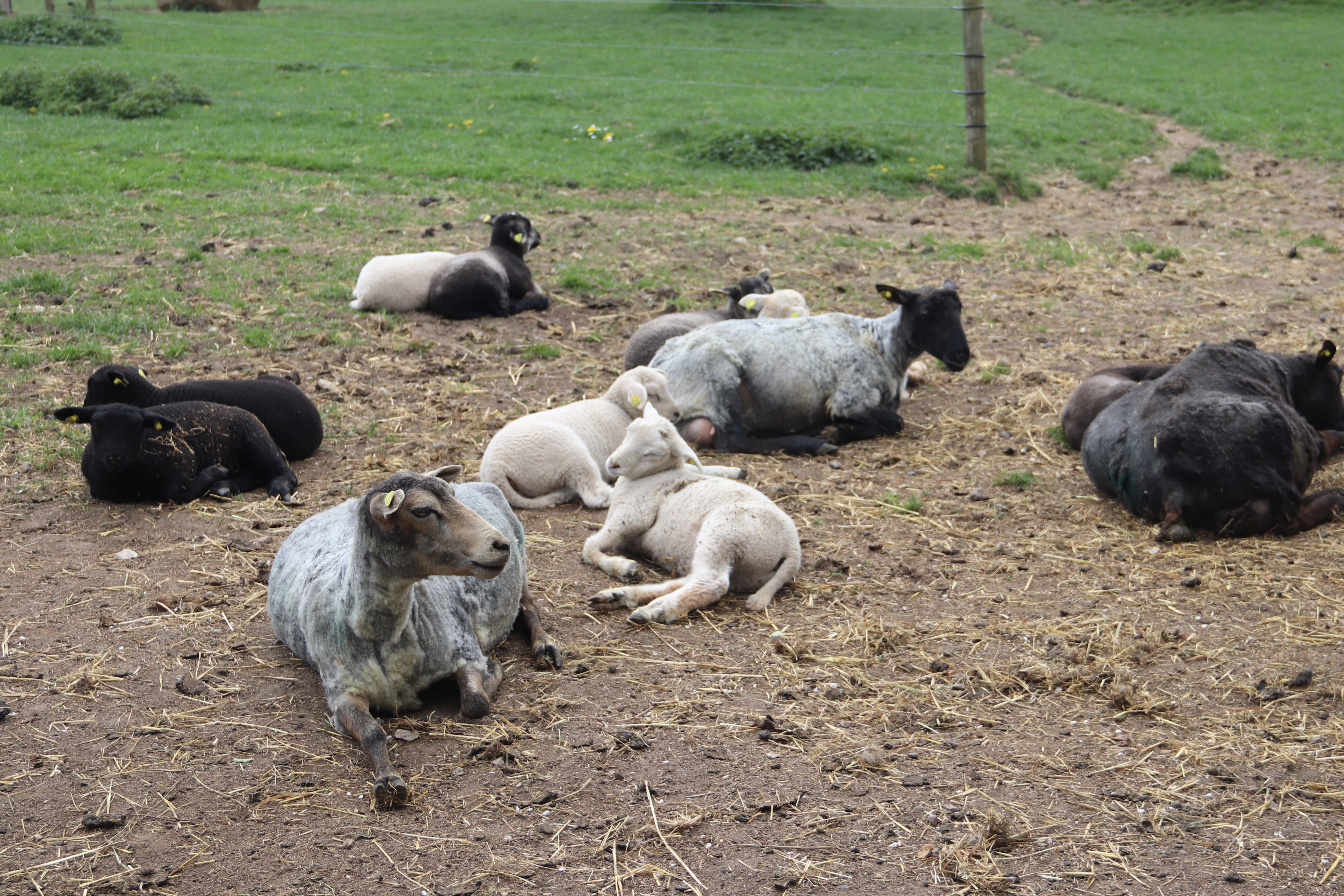 Jeg har ikke fået fortalt klippedagen til ende. Men sidste torsdag blev alle fårene jo klippet – og de blev ledt ud på græs, mens lammene blev inde i fårehusets aflukke. Det tog de nu stille og roligt – og nogle fik endda lidt middagssøvn. Mødrene var mere oppe at køre.