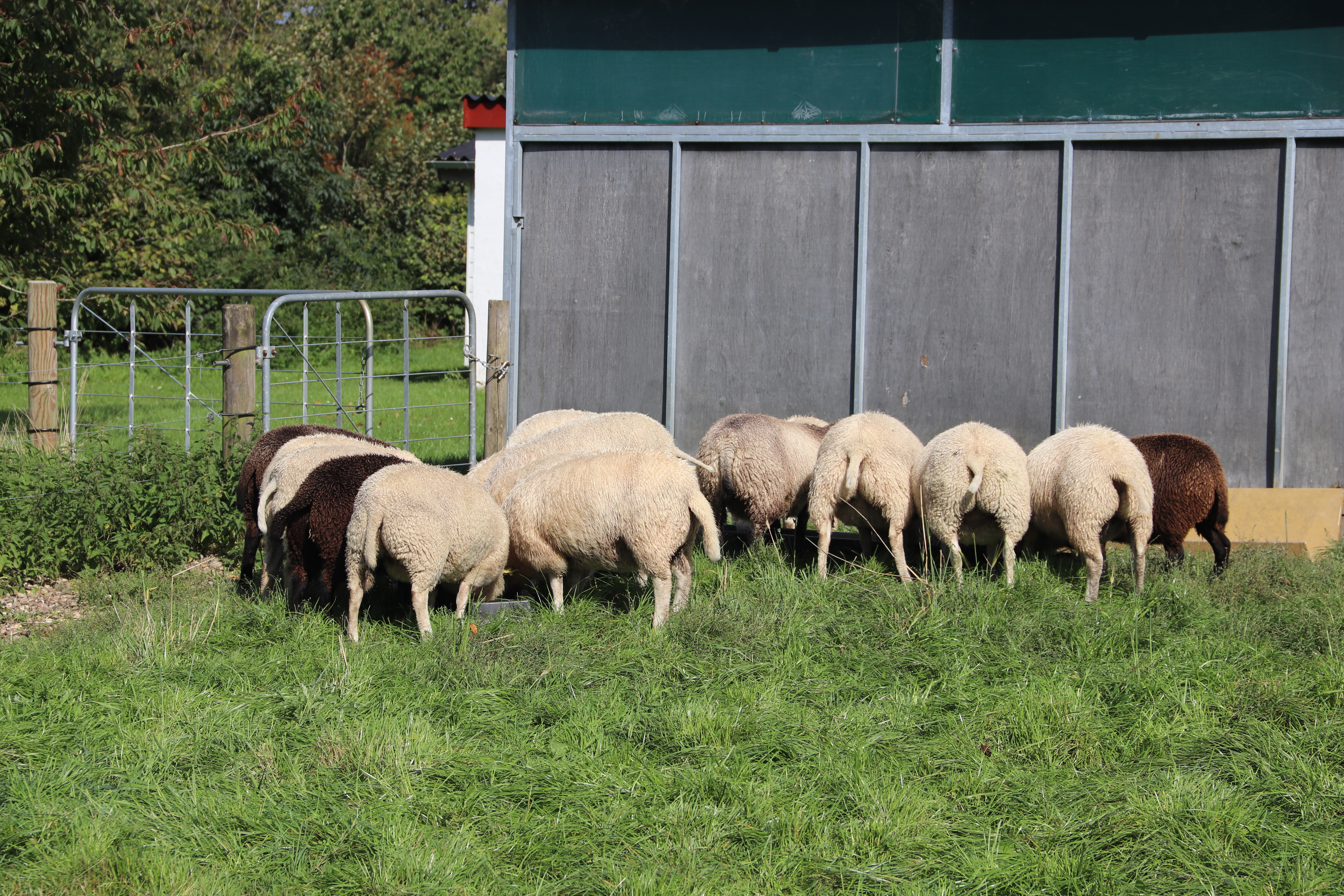 Græsset er ikke længere så kraftfuldt, så lammene er blevet fodret i de sidste uger. Det er dejligt, for så har de en anledning til at komme, når jeg kommer – og det er et dejligt syn. Herover er det gimmerlammene, der kommer susende. Nederst til venstre bliver der spist på livet løs, mens fårene er meget misundelige og føler sig snydt! Hvad de ikke ved er, at om en uge har de hele marken for sig selv og kan nyde mange gode dage endnu.