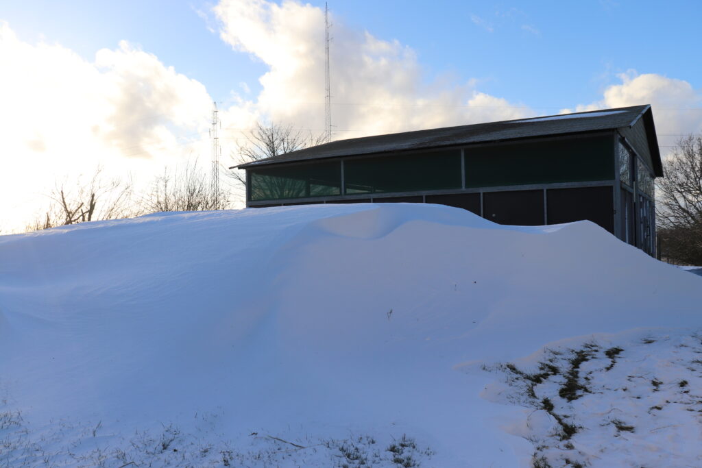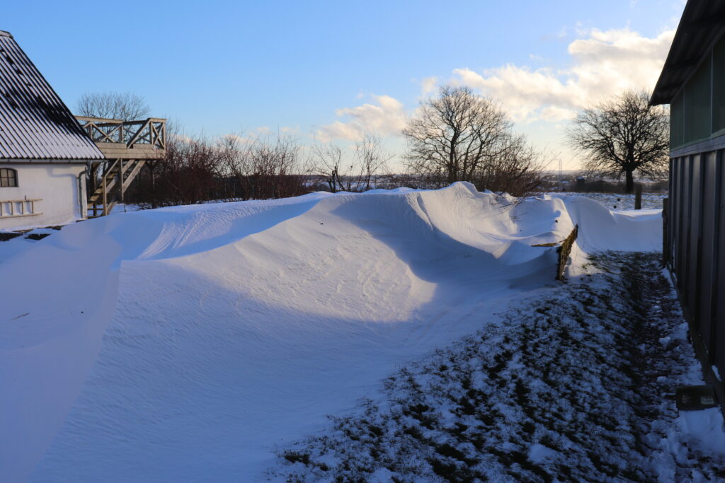 Da sneen kom lagde den sig, så fårene stadig kunne komme ud af døren og rundt på en gåtur over marken. De er ikke meget for at forcere store mængder sne, men går uden om de store driver. Sneen har ligget smukt rundt om huset i flere uger og lavet flotte dramatiske driver. Det næstsidste billede viser, hvad der for et par dage siden var tilbage af vores store snedrive. Den har i større eller mindre tilstand har ligget henover blåbærbuskene siden begyndelsen af januar! Nu er den væk. Foråret er på vej!