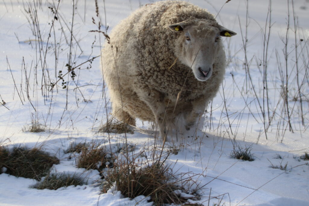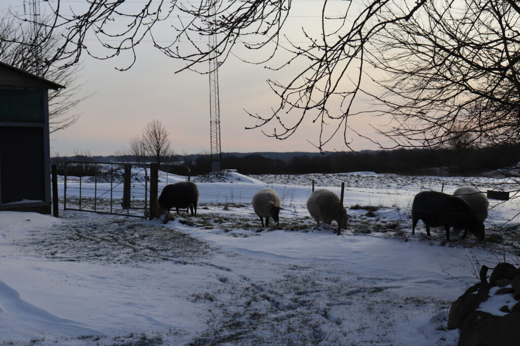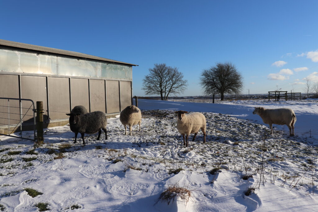 Den megen østenvind i januar var da pivkold, men fårene har deres tykke uld og når de ligge inde i læ i fårehuset i den tykke dybstrøelse holder de fint varmen. Når jorden er frossen, kan fårene gå tørskoede rundt ovenpå og får ikke trukket fugt og mudder med ind i stalden, så det er langt at foretrække frem for en våd og lun vinter, synes jeg.