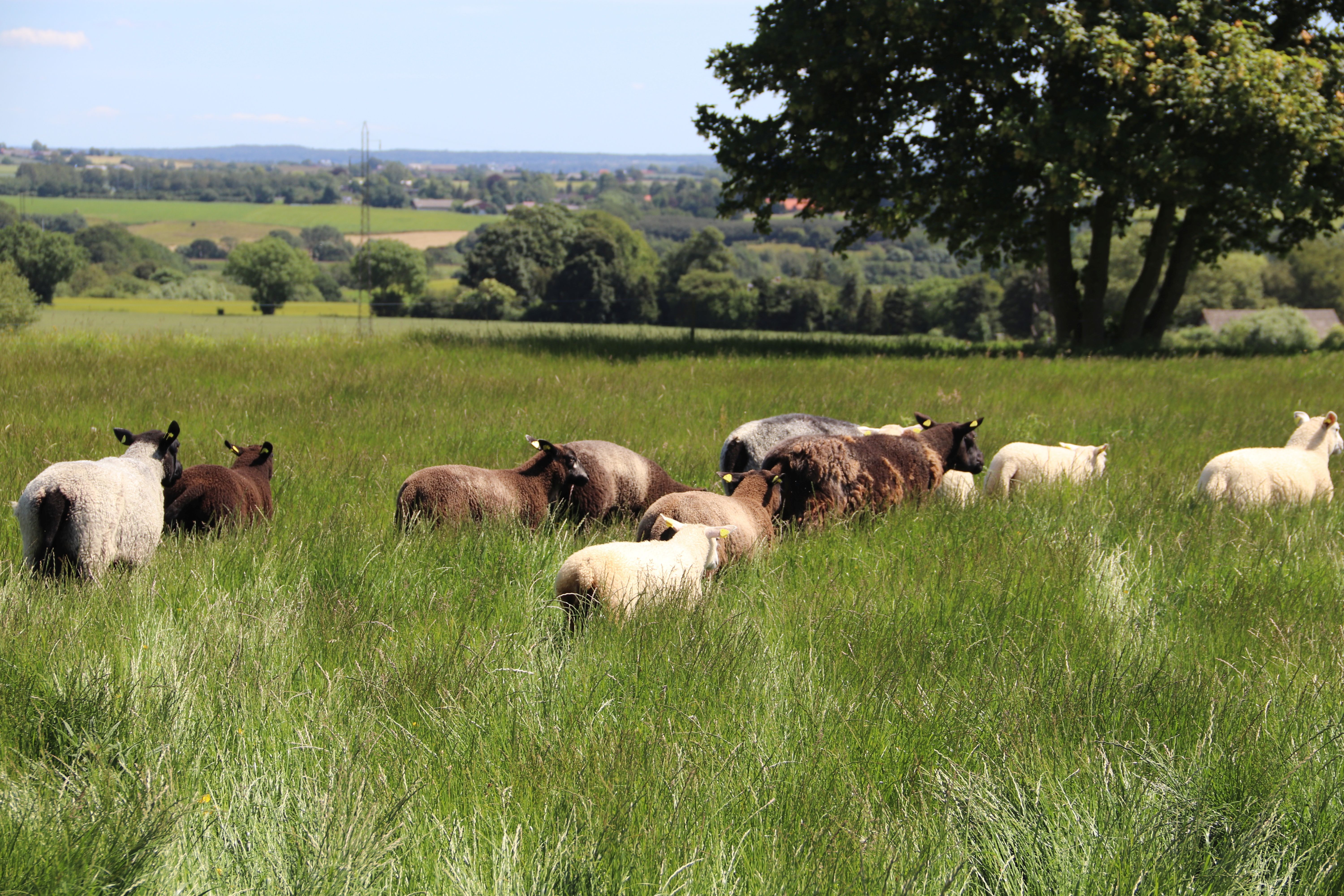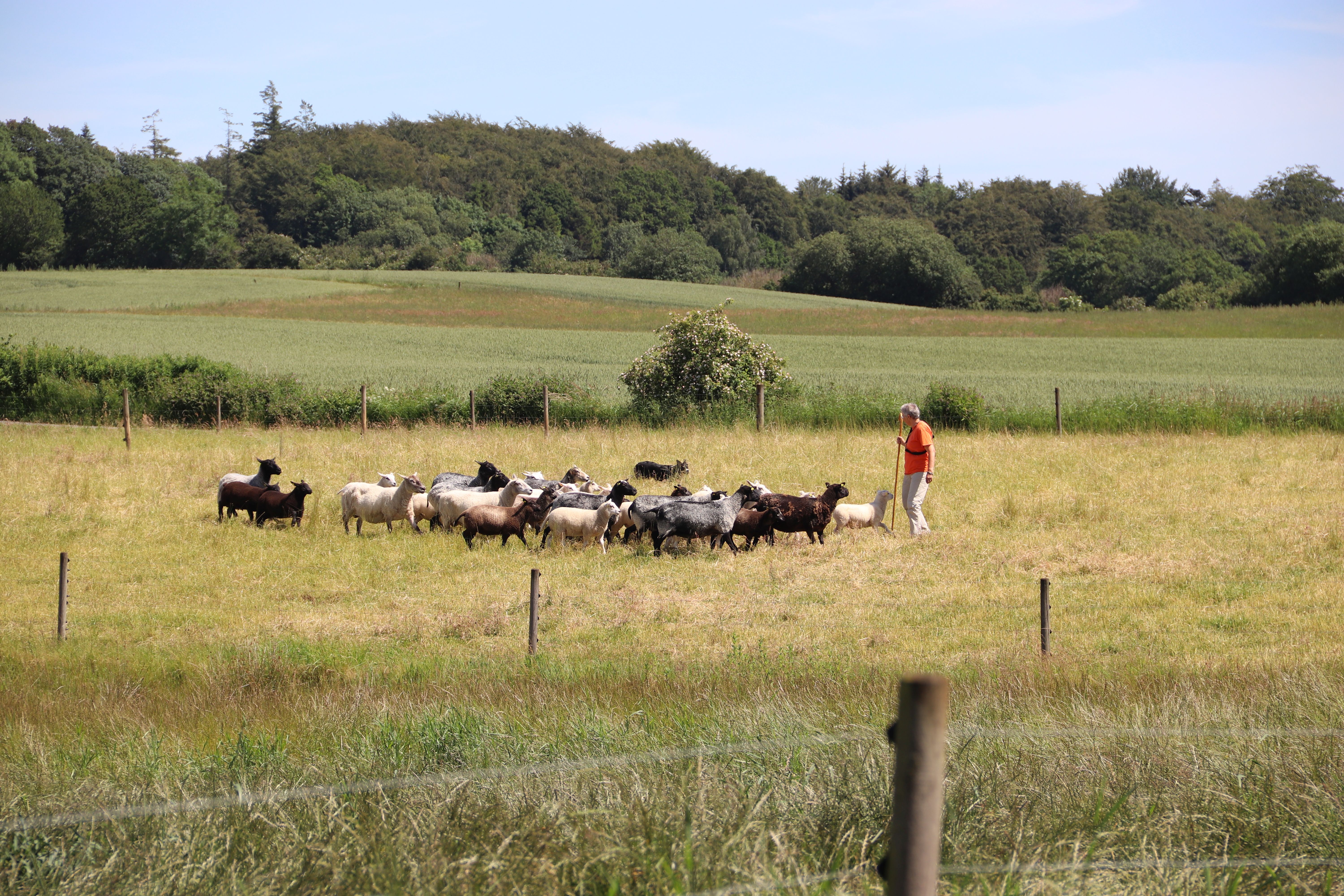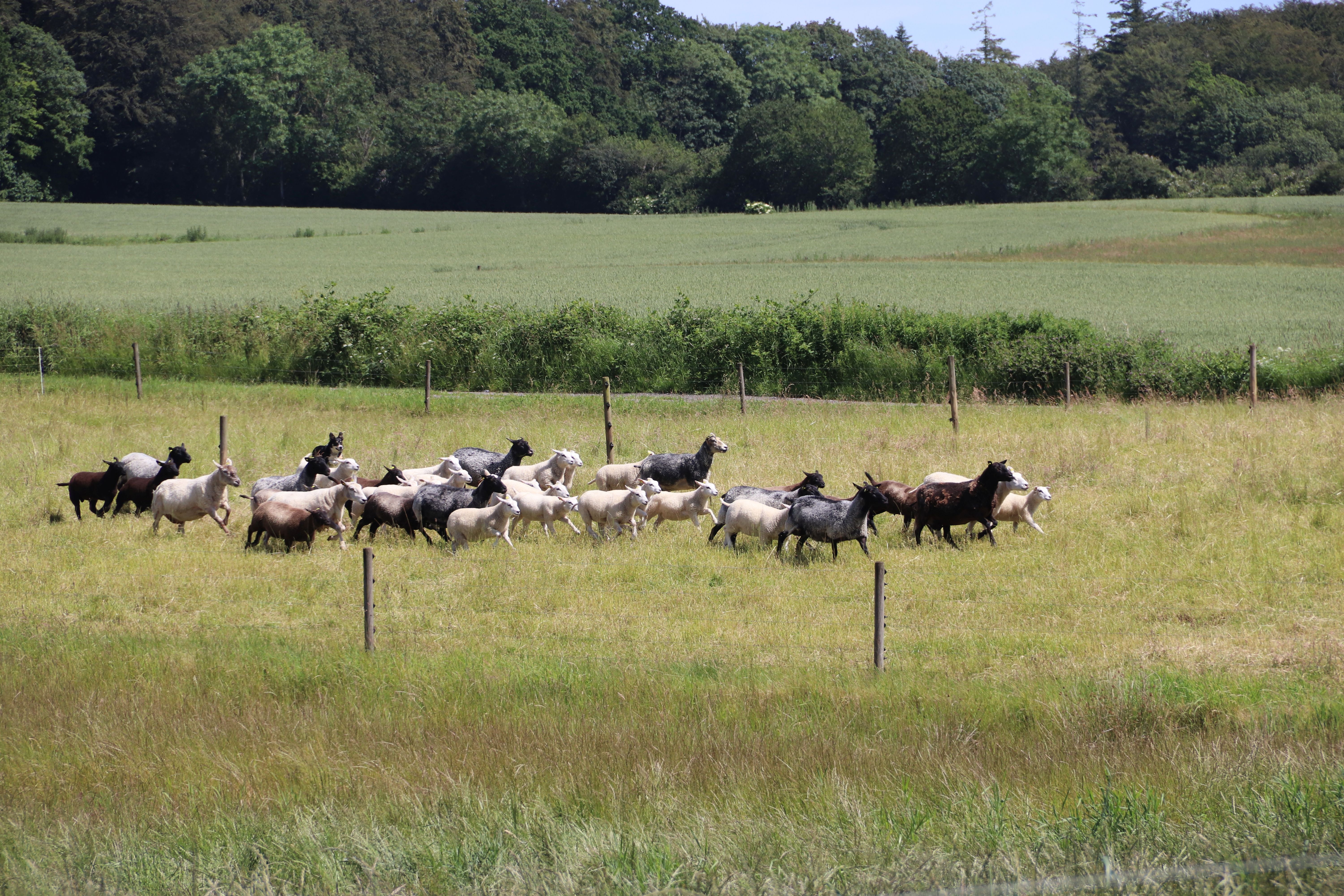 Så drog vi i samlet flok mod de kendte græsgange. Gærdesmutte vidste nok, hvad vej vi skulle og havde stor lyst til at komme frem i en fart, så vi to-benede havde nok at gøre med at holde tempoet på flokken nede. Efterhånden slappede Gærdesmutte da lidt af og blev forpustet – men ikke mere end, at hun lå i spidsen hele vejen og jævnligt skulle mindes om ikke at overhale os andre. Turen gik fint, bistået af søde og hjælpsomme naboer og venner til fods, cykels og i bil- og stor var lykken, da flokken kom hjem på egen mark med masser af græs. Kun Tara syntes, det sjove var for hurtigt forbi!